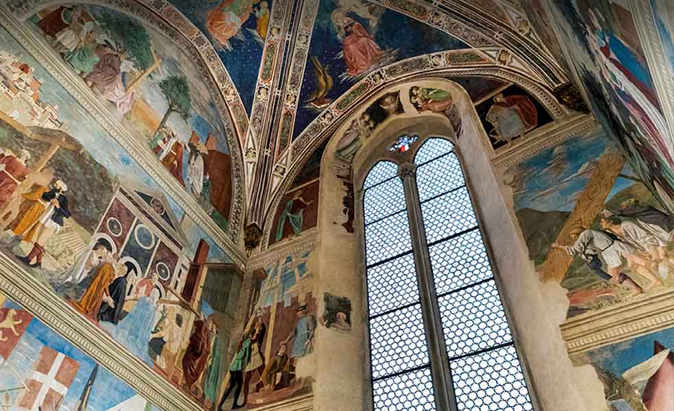La Basilica di San Francesco, scrigno di uno dei capolavori assoluti dell’arte italiana, custodisce uno dei cicli pittorici rinascimentali più famosi e conosciuti in tutto il mondo, la Leggenda della Vera Croce di Piero della Francesca.